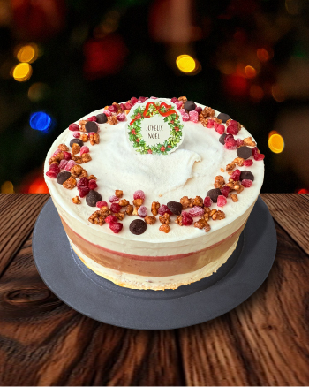 ご家族や友人と囲むテーブルを華やかに彩る、大人数でシェアするのにおすすめのサイズです。 香ばしいヘーゼルナッツとスパイス、いちごの甘酸っぱさ、チョコレートのコクが重なり合います。賑やかで心温まる時間にぴったりの、贅沢なホリデーケーキです。