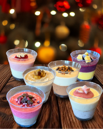 どのカップも、2種類のアイスを重ね、仕上げにフルーツ、ナッツ、ソースなどのトッピングをあしらいました。
